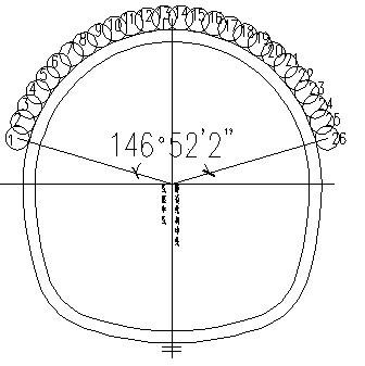 1、在拱部約150°范圍內開挖外輪廓250mm處布設水平旋噴樁,如上圖所示共26顆。